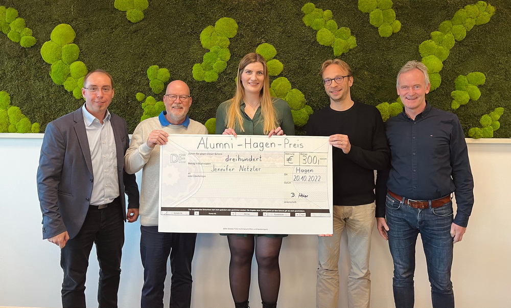 Genau dieser Einsatz zeigt und unterstreicht, weshalb Jennifer Netzler mit dem Alumni-Hagen-Preis 2022 ausgezeichnet wurde. Vor Allem hat Frau Netzler mit ihren Aktivitäten und ihrem Einsatz dafür gesorgt, das Ansehen der Hochschule sowohl intern als auch extern außerordentlich zu stärken. So wirkte sie beispielsweise in Imagevideos mit und unterstützte tatkräftig bei verschiedenen Marketingaktivitäten sowie den Erstsemestereinführungen des Fachbereichs Technische Betriebswirtschaft. Darüber hinaus betreute sie Schülerinnen und Schüler seitens des Fachbereichs bei der Schulkooperation und engagierte sich tatkräftig für die Belange der Studierenden. Und sie unterstützte als Mitglied im Senat, im Fachbereichsrat Technische Betriebswirtschaft, im Kuratorium der Hochschulstiftung oder der kommissarischen Ethikkommission.